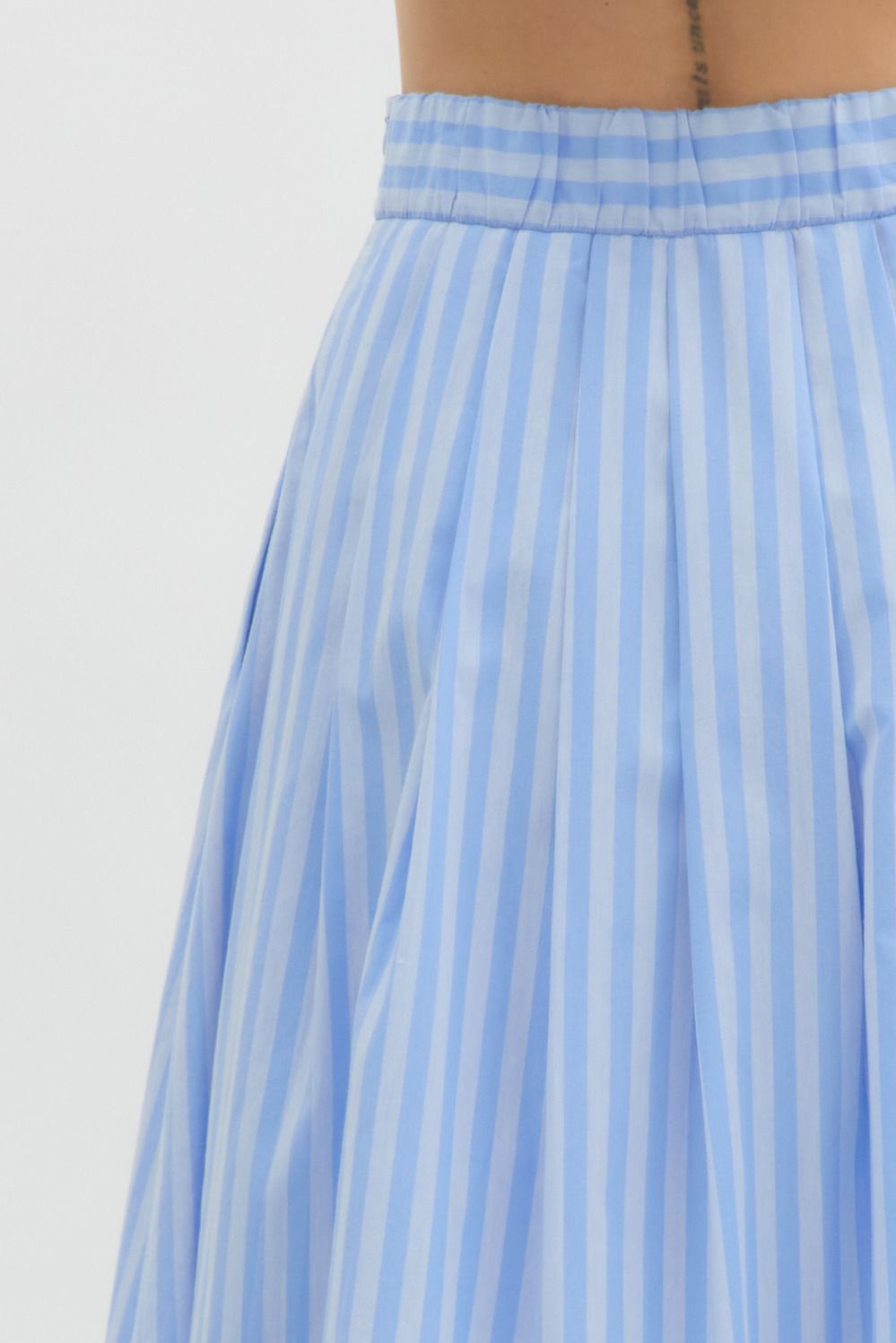 Hello summer! Welcome the Kelly skirt to your wardrobe. Wear it with a sporty knit top or make it a playful set with the matching blue striped top! This skirt features an elastic back and side pockets.
