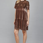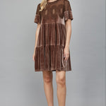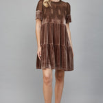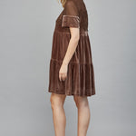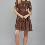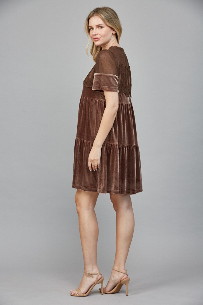 Get ready to turn heads in our Brown Velvet Dress with Sheer Mesh Panel. This tiered short dress features a lace bodice and short sleeves for a touch of elegance. Perfect for any holiday occasion, this dress will make you feel fabulous and comfortably chic!