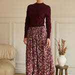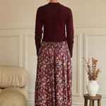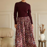 - Elegant pleated skirt with a rich burgundy pattern that adds movement and visual interest.