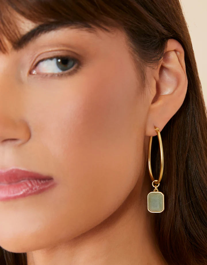 Our Chateau Hoop Earrings feature faceted stones intricately framed in 18kt matte gold plating, dangling from golden hoops. Bonus, remove the drop for a simple gold hoop. 2-looks-in-1! Please note: This design features natural stones and each piece is one-of-a-kind. Colors and patterns may vary slightly from the image shown.