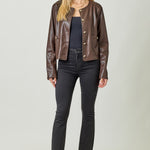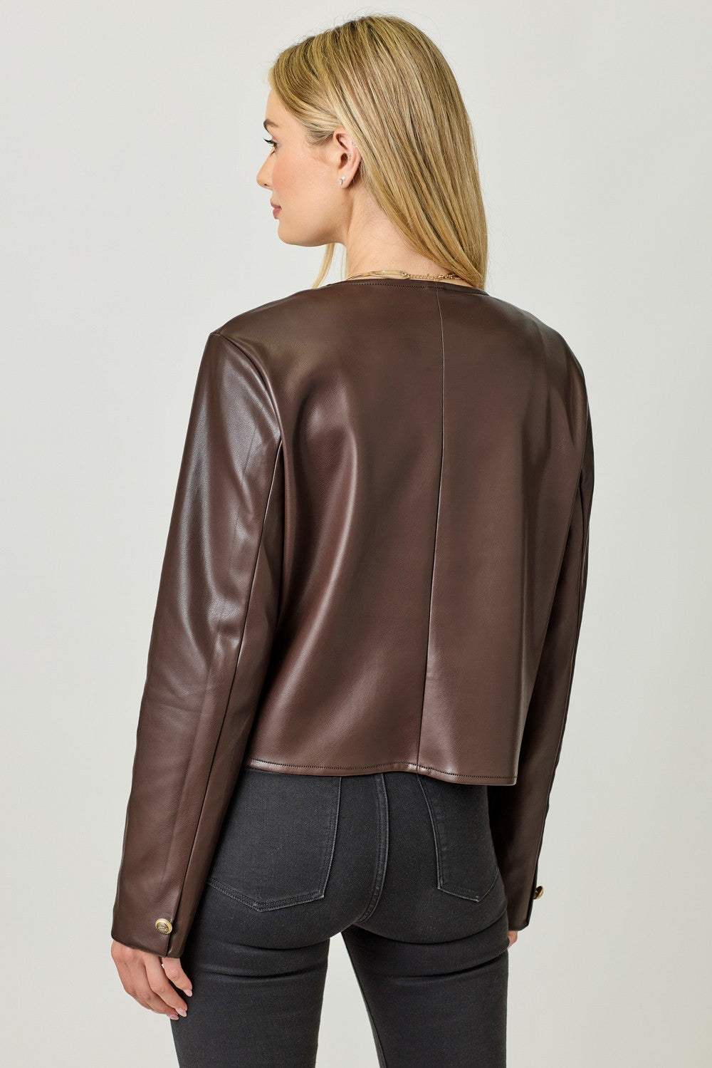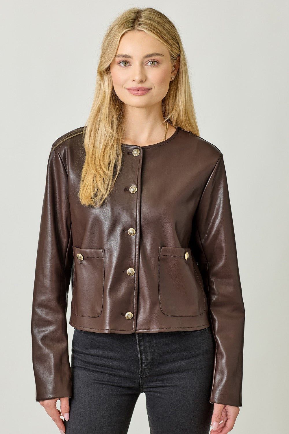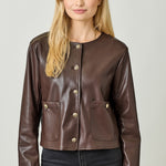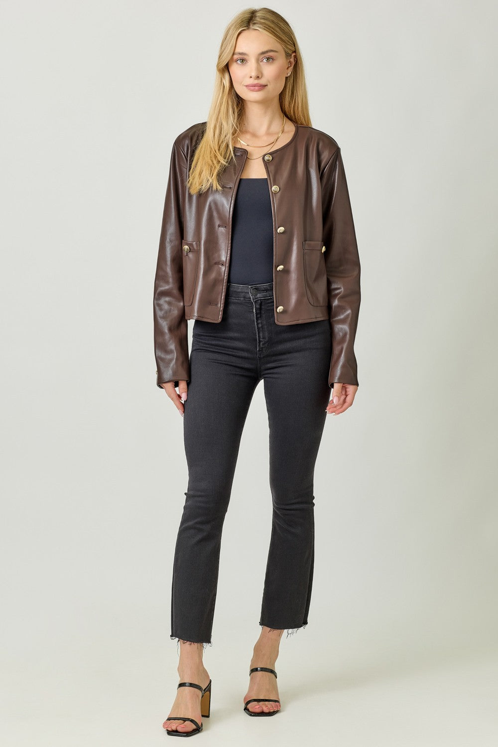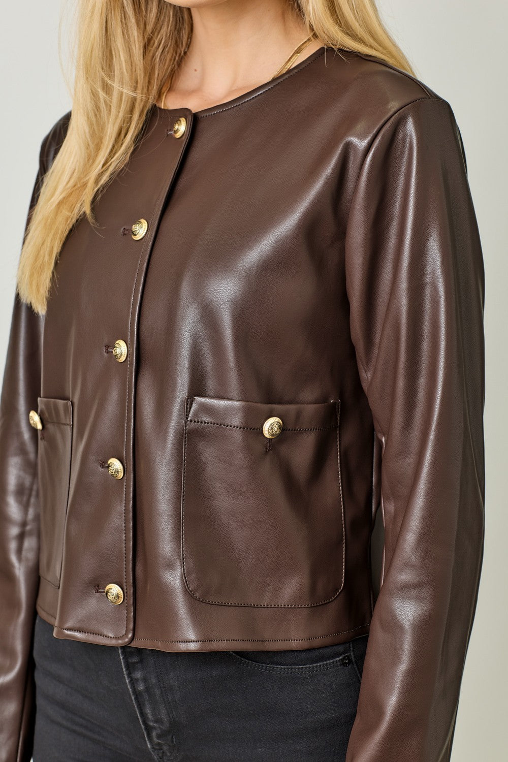 Add some edge to your style with this faux leather jacket. Featuring gold buttons and long sleeves, this jacket is perfect for any occasion. The smooth finish and classic silhouette make it the perfect layering piece for work, weekend, or a night out. (Rock on with this jacket and look effortlessly cool!)