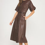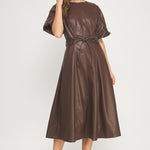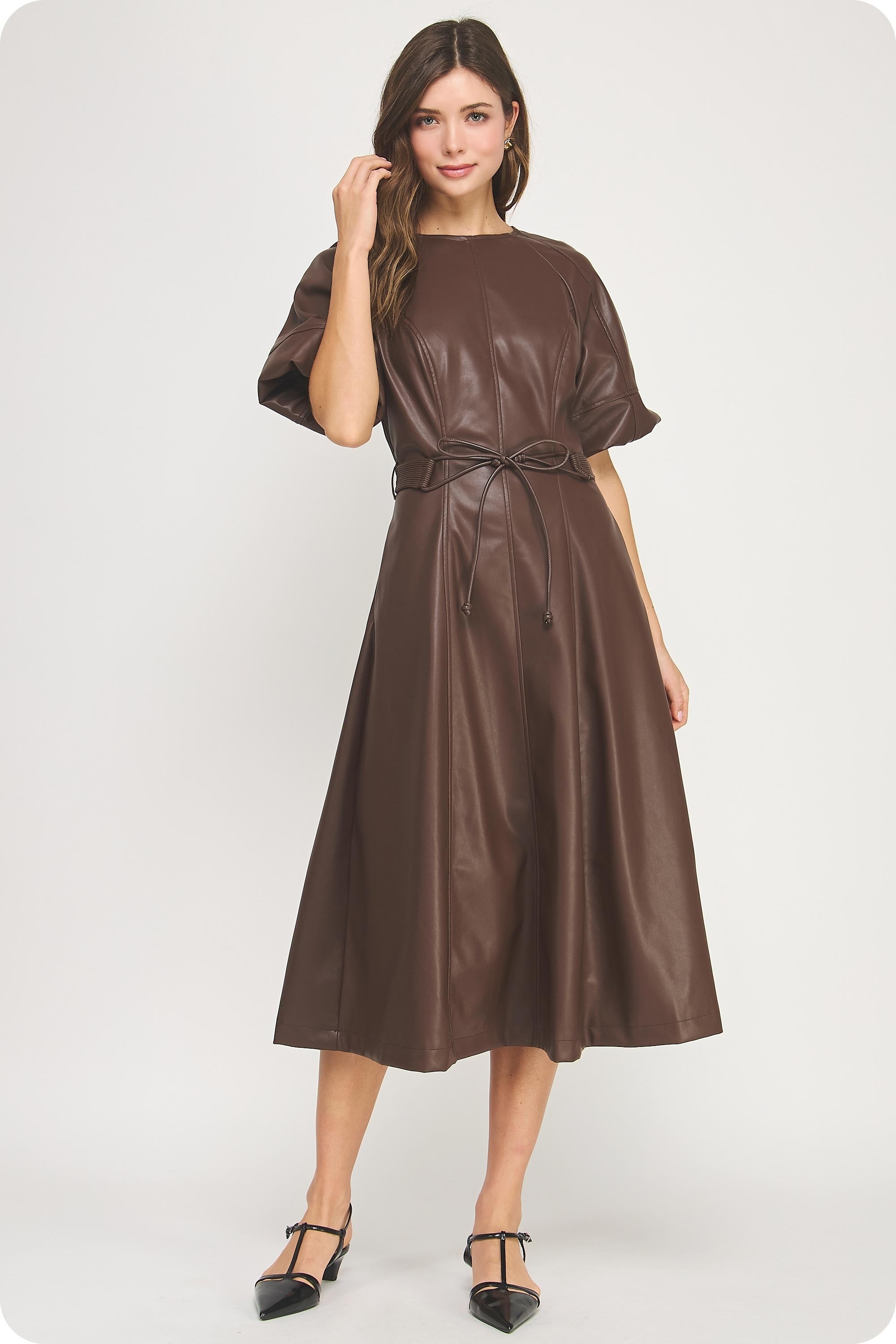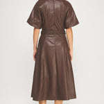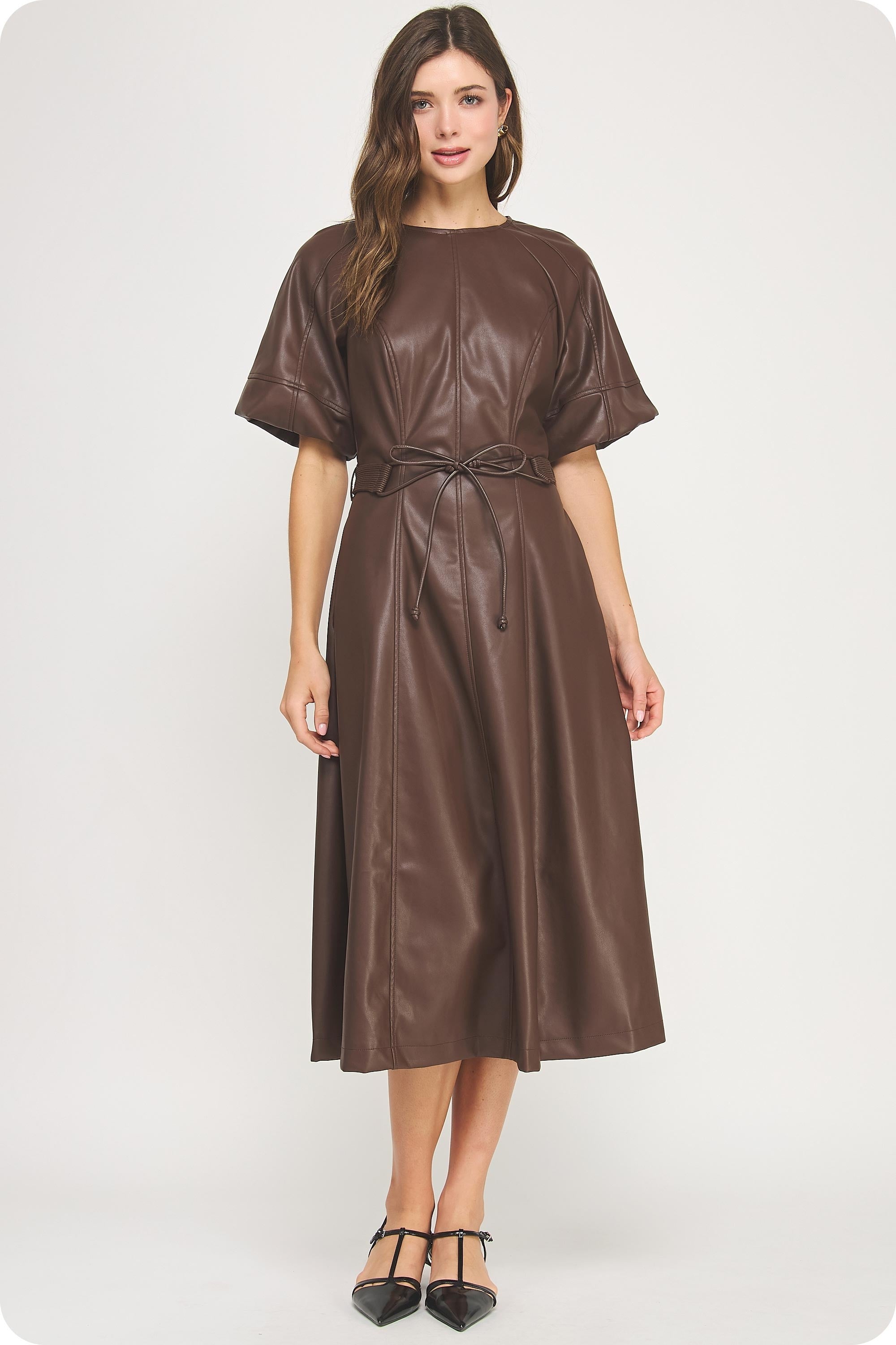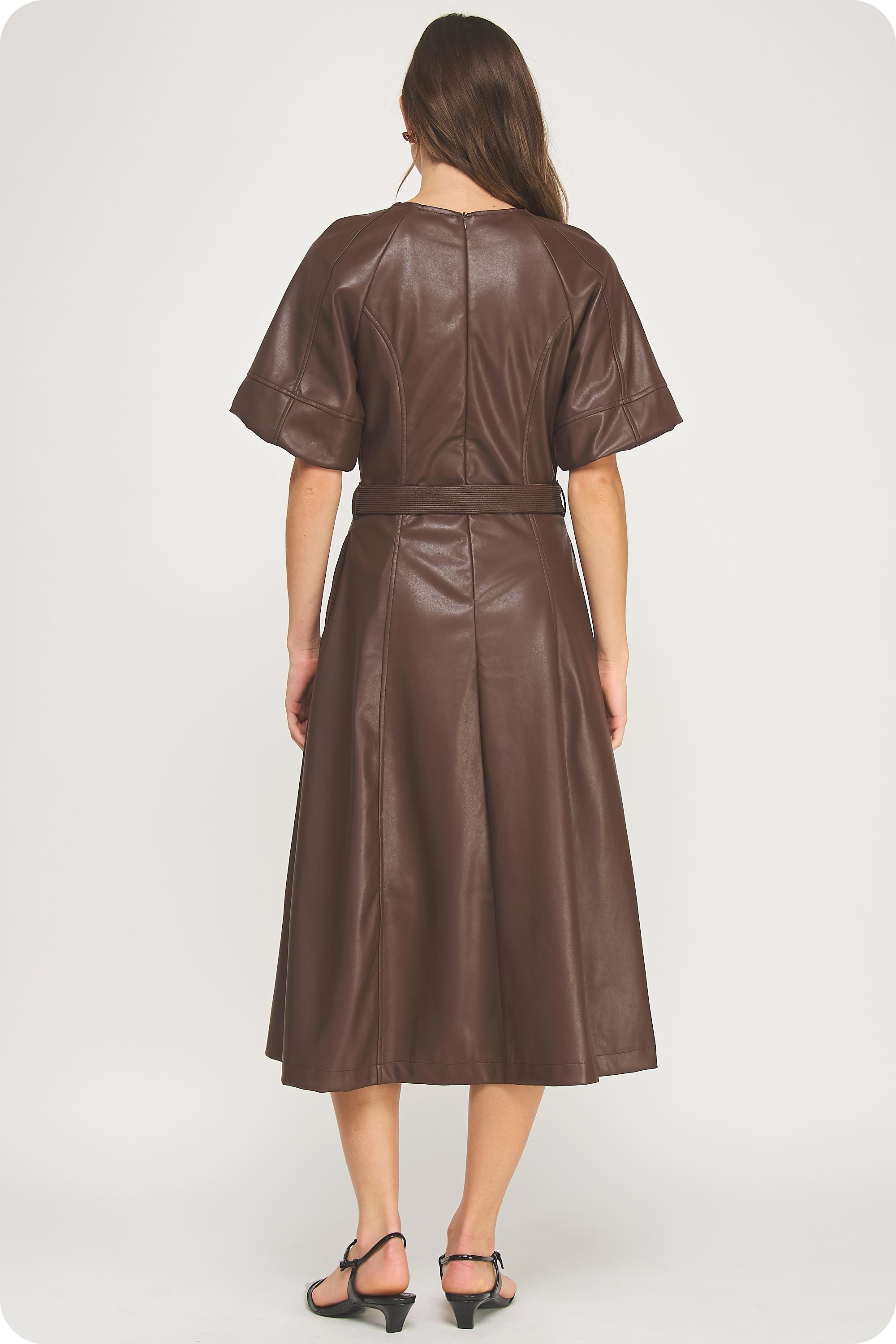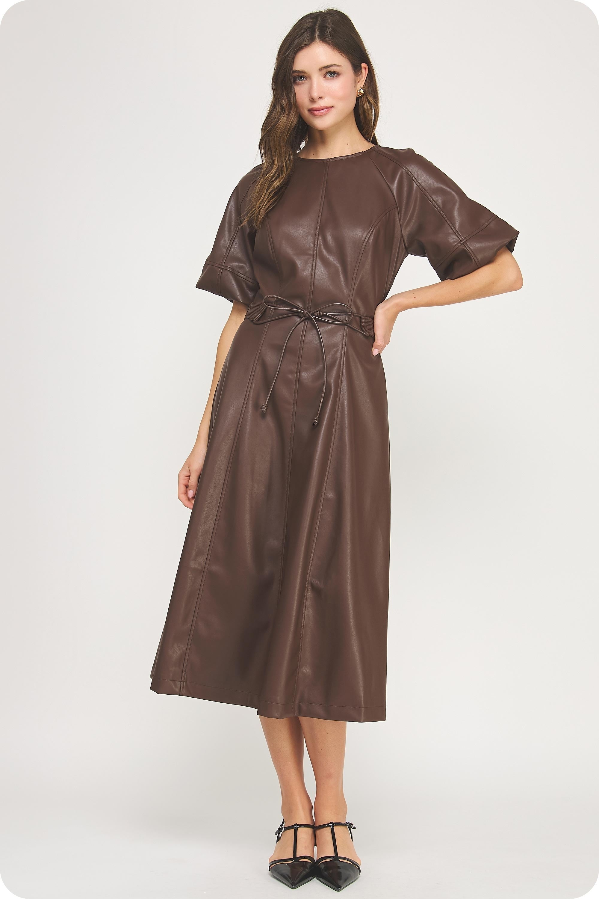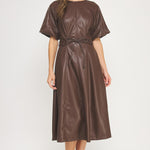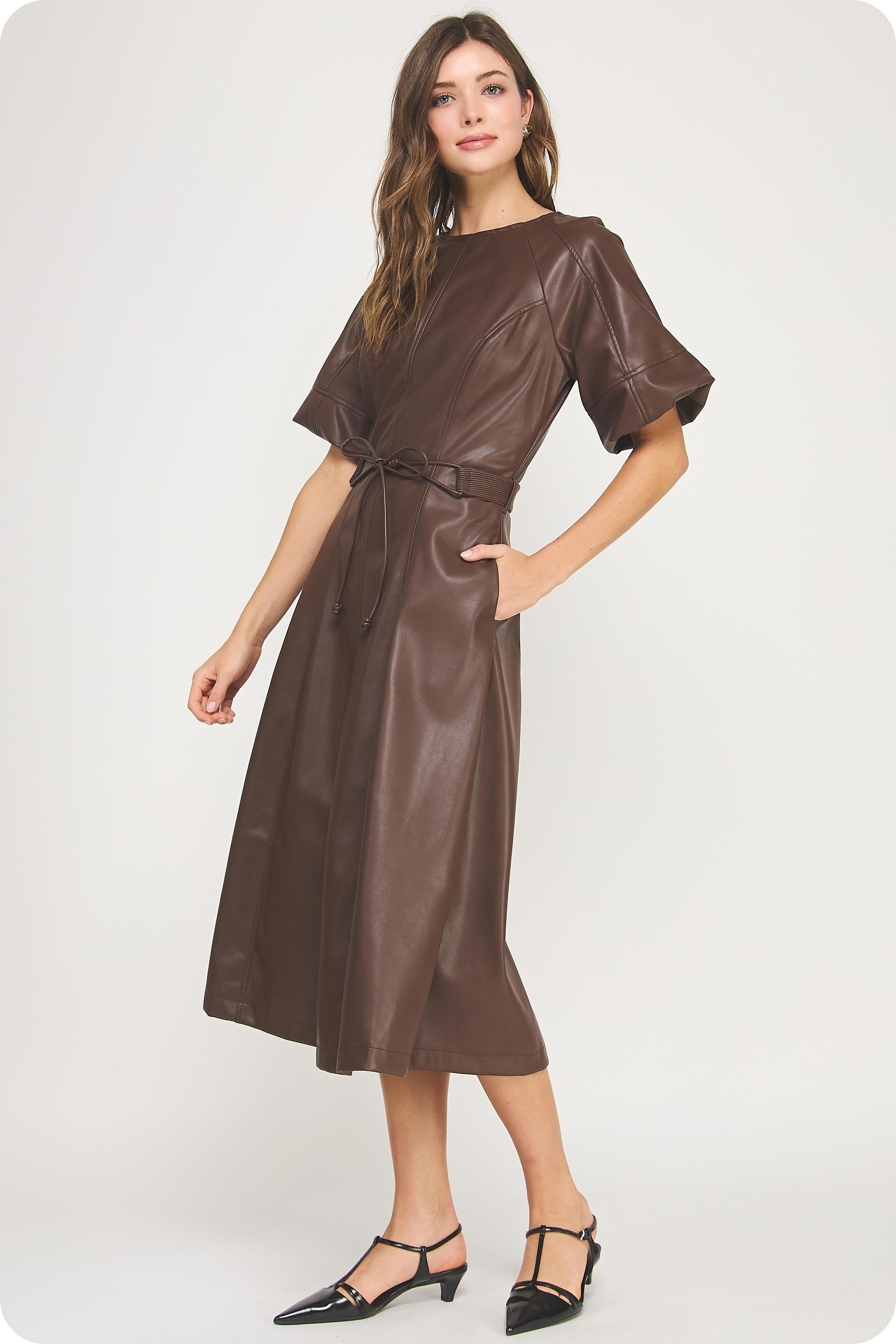 Crafted from soft and durable faux leather, this long mocha mousse dress adds a touch of luxury to any occasion. Featuring short sleeves, a coordinating belt, and an elegant a-line skirt, this dress is both stylish and comfortable. Perfect for making a statement and standing out from the crowd.
