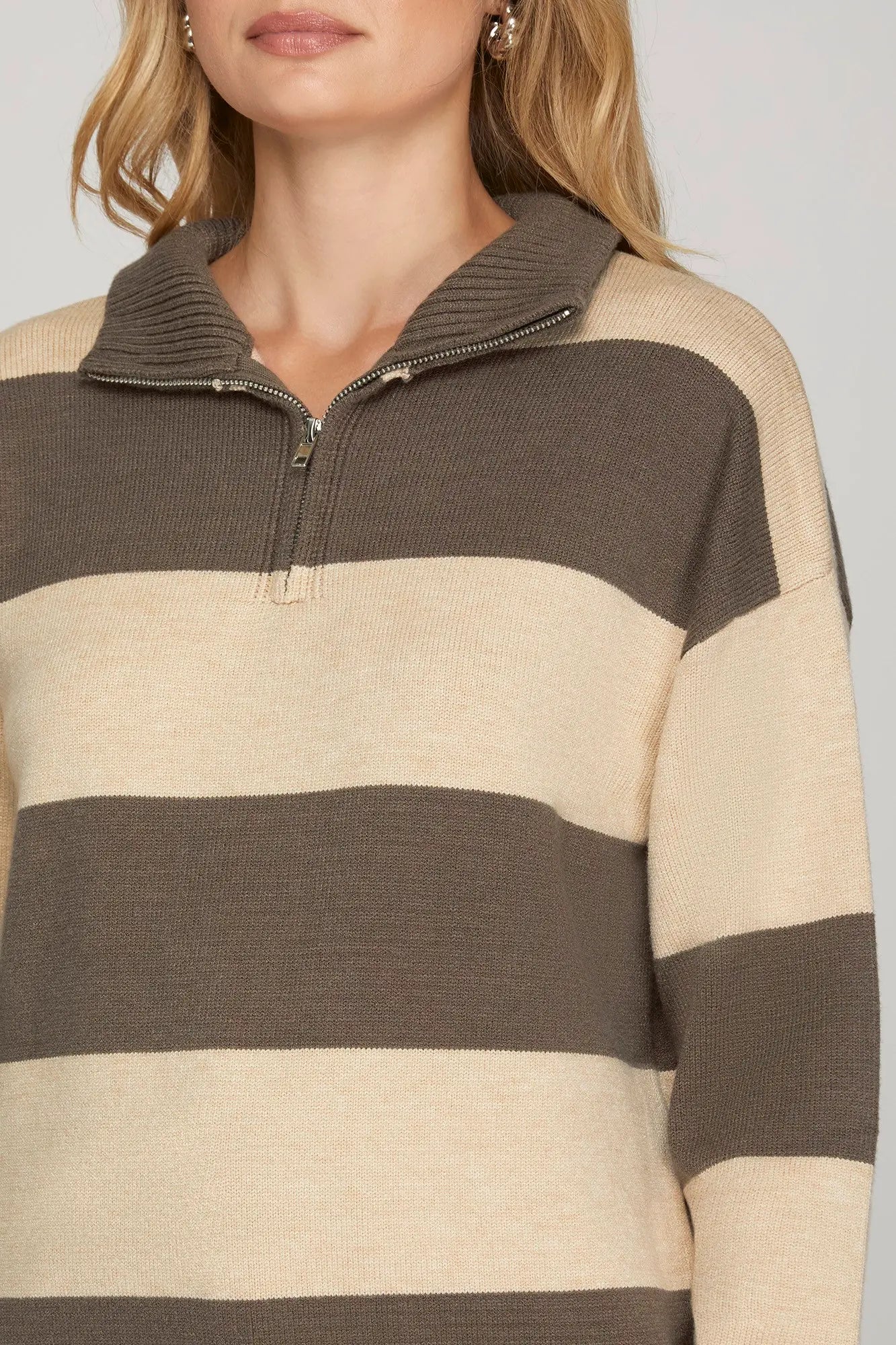 Cozy meets cool in this striped half-zip sweater. Featuring bold mocha and cream stripes, this pullover is an instant outfit-maker. The ribbed collar with a functional half-zip adds a sporty-chic touch, while the relaxed fit keeps it comfy for all-day wear. Pair it with jeans for weekend errands, leggings for lounging, or layer it over a collared shirt for an elevated preppy vibe.