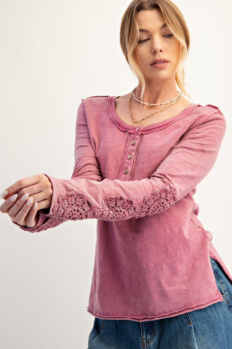 Rose Mineral Wash Henley Top with Lace Sleeve Detail