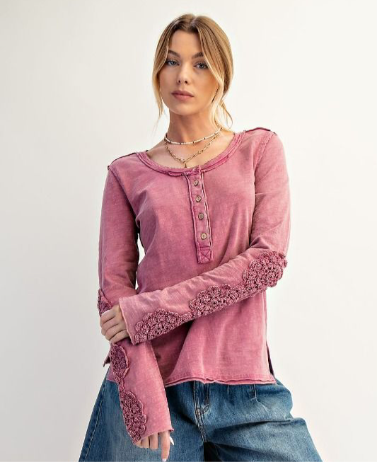Your new go-to long sleeve just got a romantic upgrade! This mineral-washed Henley top in a soft rose hue combines casual comfort with feminine details. The relaxed silhouette features a five-button front placket and raw edge neckline for a lived-in vibe, while the floral crochet lace insets along the sleeves add just the right amount of charm.