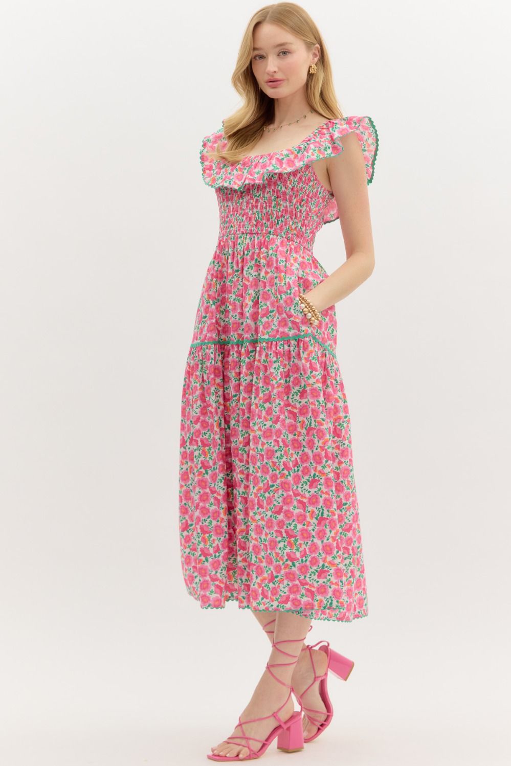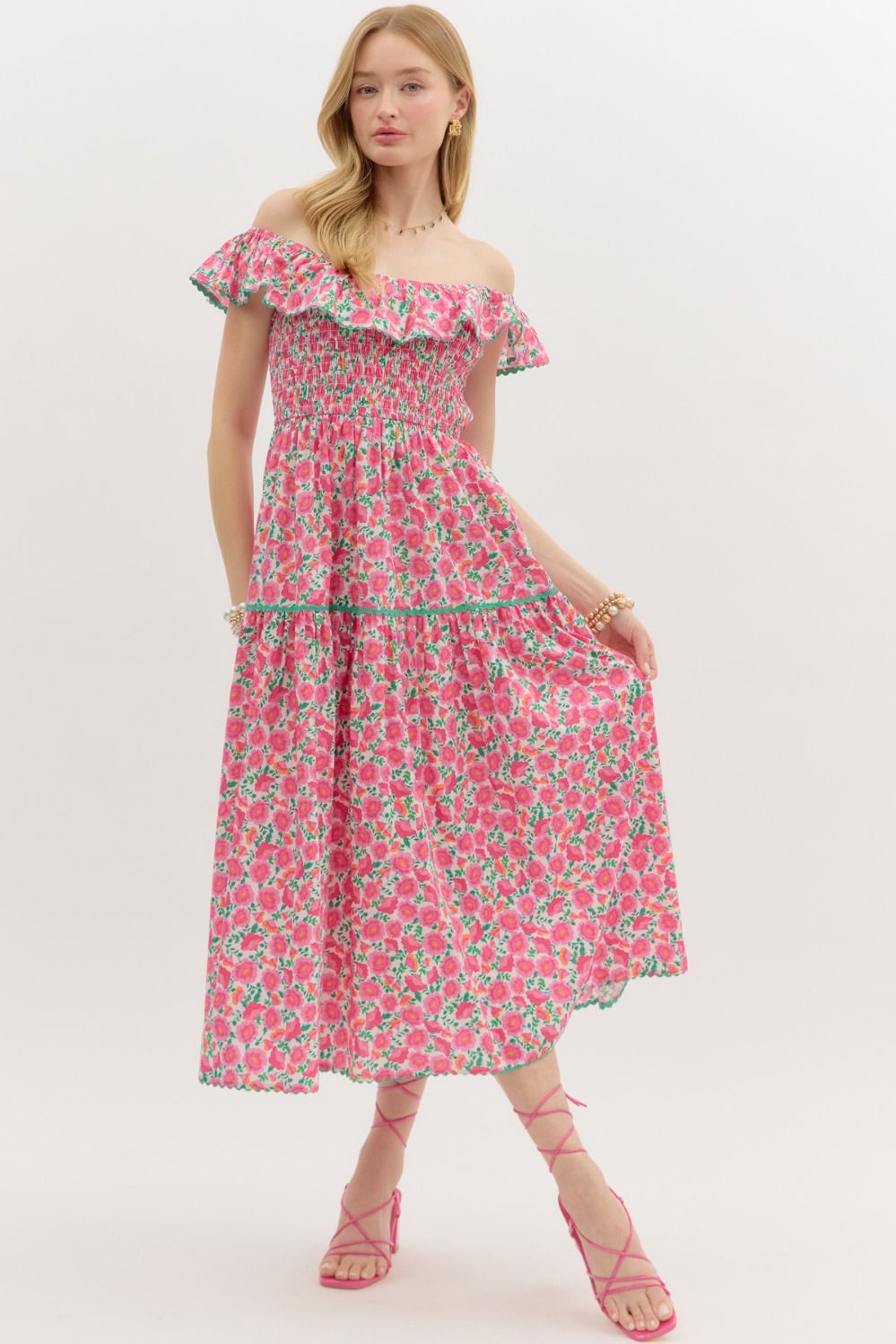 This sweet floral dress reminds us of a fresh summer day! Pair it with your favorite sandals and meet friends for brunch or wear it to a bridal or baby shower. Wear it on or off your shoulders.