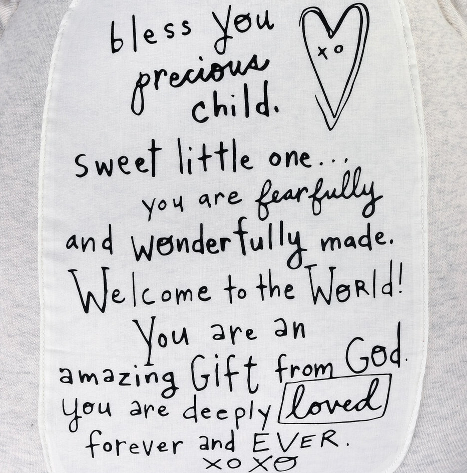 - An ivory-colored teddy bear which features the message "Bless you precious child. Sweet little one, you are fearfully and wonderfully made. Welcome to the World! You are an amazing gift from God you are deeply loved forever and ever. xoxo" on its front.