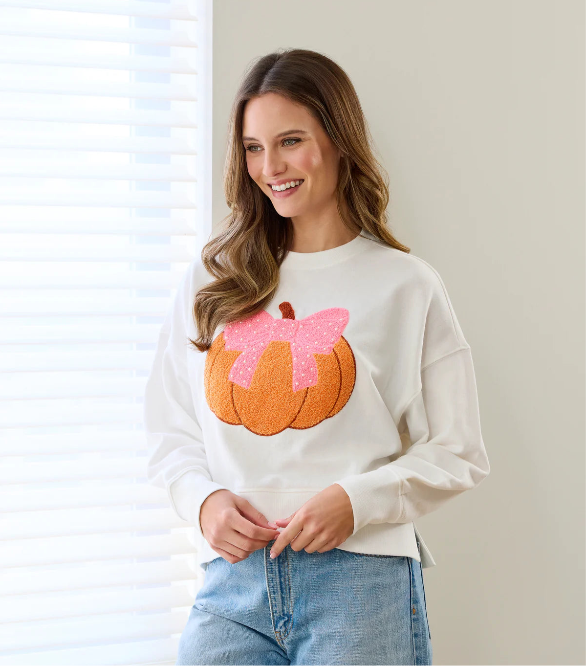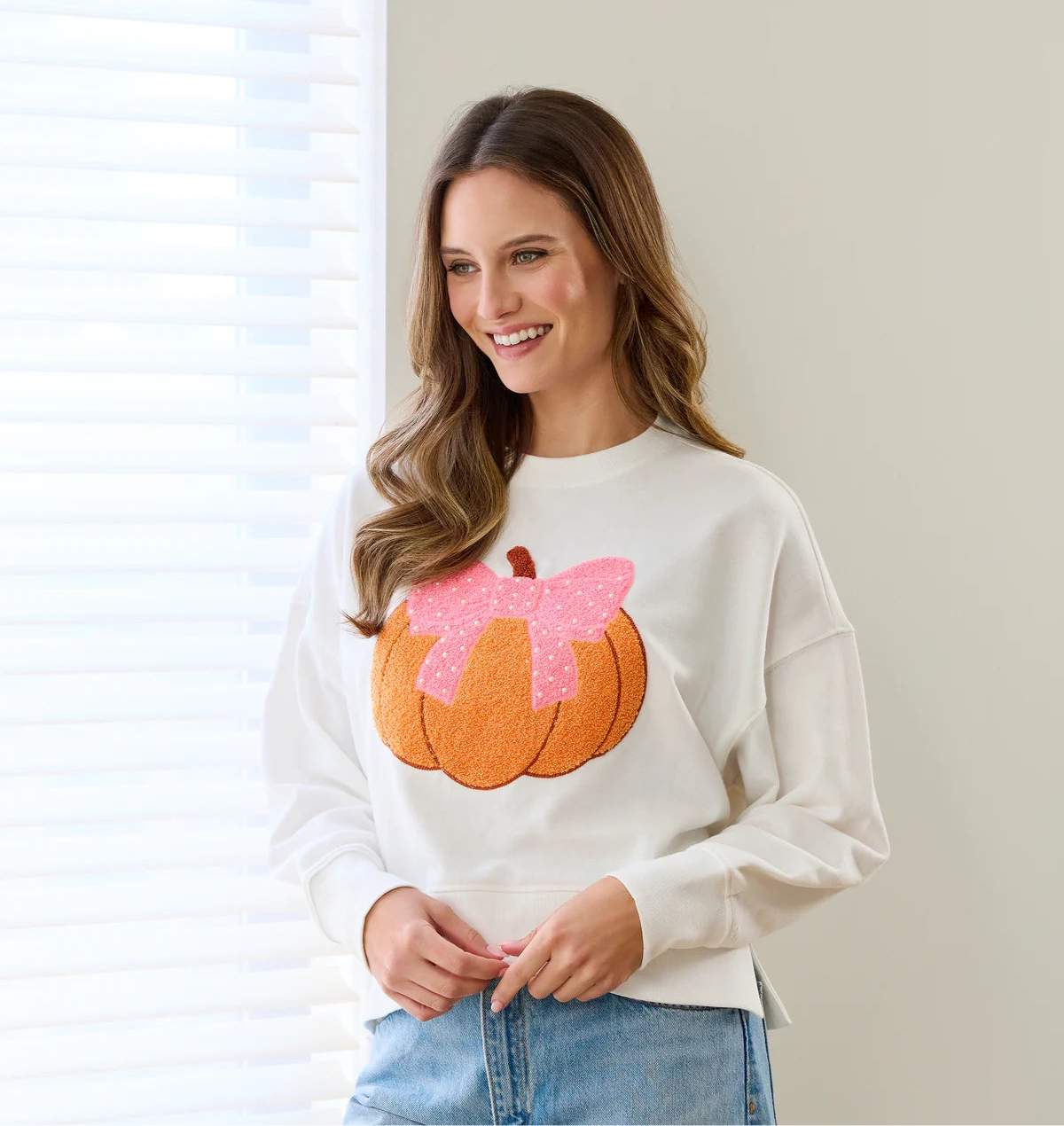 Fall just got a little more fabulous with this cozy-cute sweatshirt featuring a chenille pumpkin topped with a sparkly pink bow. Designed with a relaxed fit and soft cotton blend, it's perfect for sipping cider, pumpkin-picking, or lounging in style. The ivory hue makes it an easy match with your favorite denim, leggings, or skirts. Consider it your go-to for all things autumn, with a sweet twist!