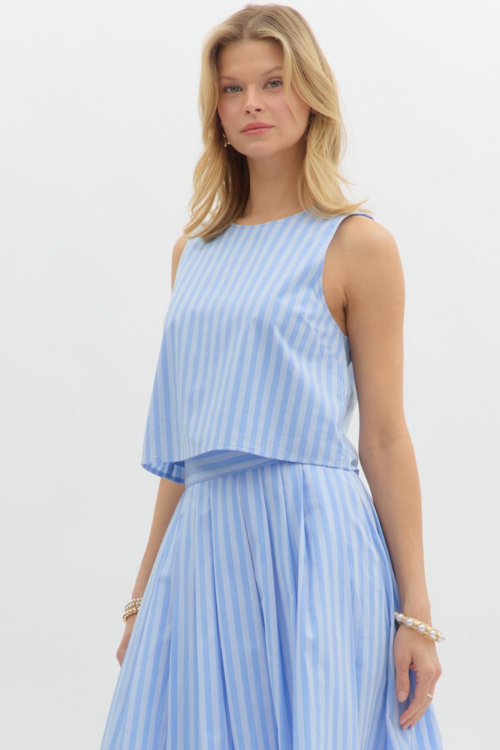 Create a playful set with the matching blue stripe skirt or pair it with jeans or shorts for a casual look. This striped top requires a second look! The button back detail shows off fun wooden buttons. Be ready for vacation or the hottest days of summer with our Julie top.
