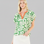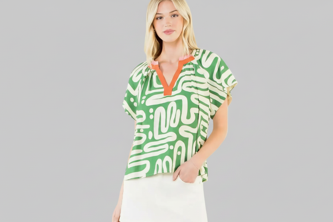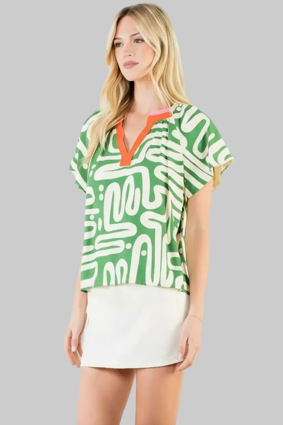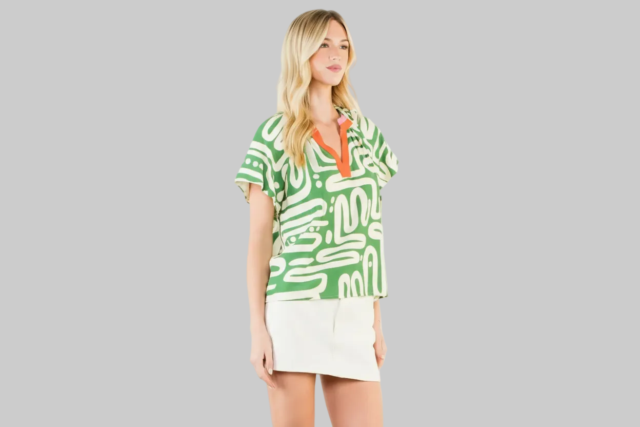 Get vacation ready in the THML Green Abstract Print Top! This snazzy number in sassy Kelly green features a funky abstract print with a pop of orange trim (because why not add a splash of zest?). Perfect for when you're feeling the vacation vibe, or anytime, but also want to keep it fun—style has never been this easy-peasy