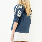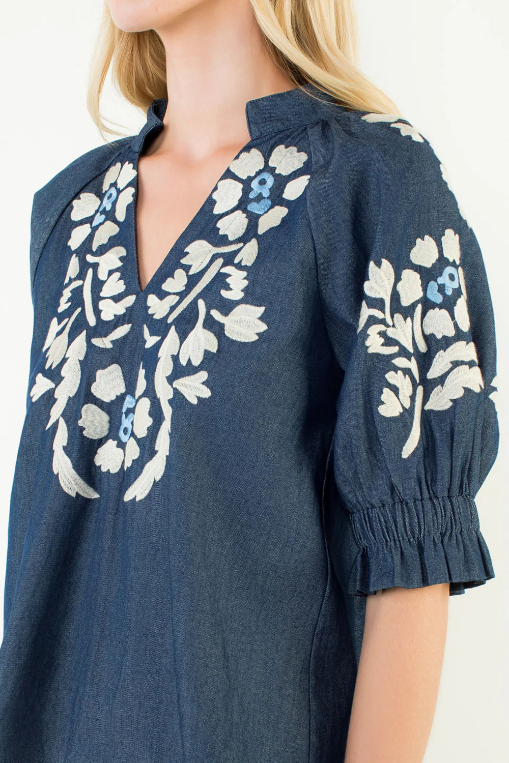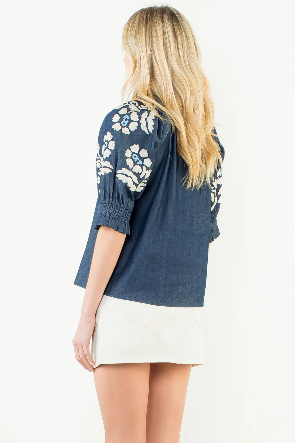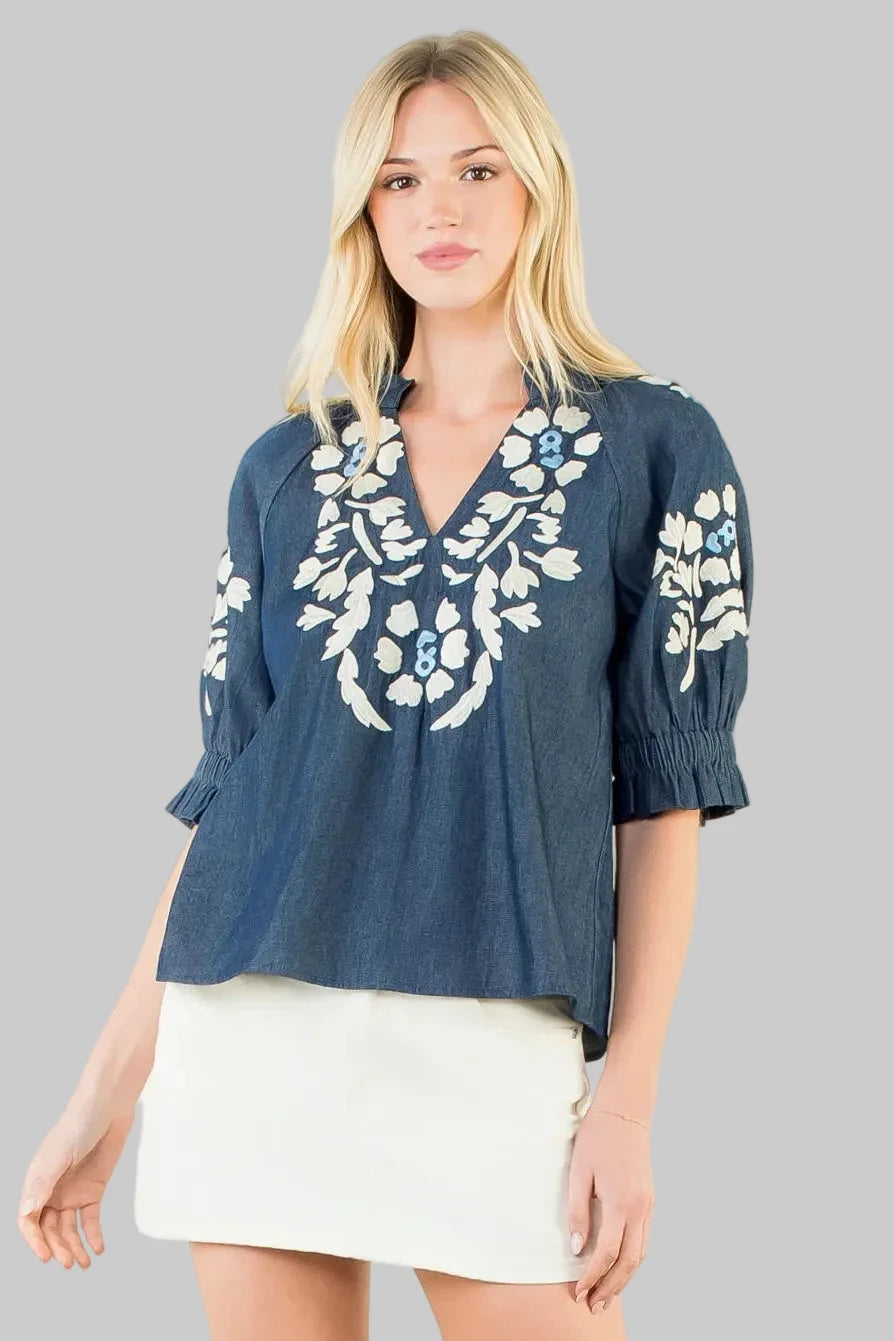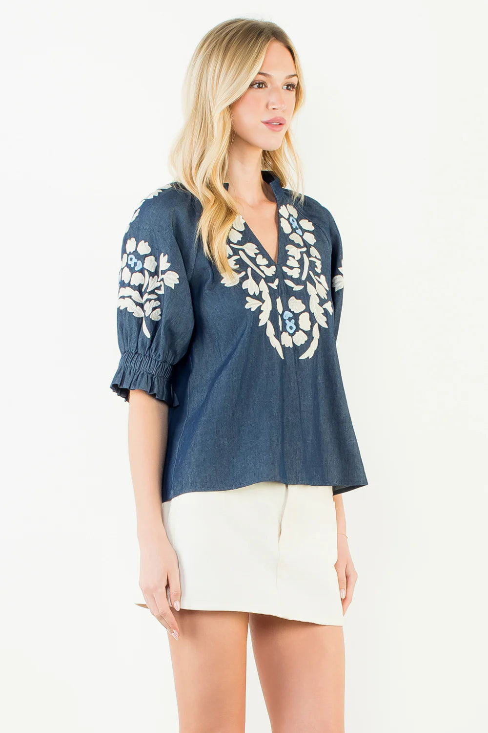 This THML short sleeve embroidered top is made from lightweight chambray denim for an easy, comfortable fit. perfect for spring and summer styling. The embroidered yoke and sleeves add a touch of sophistication, while the elastic sleeves and stand collar give it that modern, pulled-together feel.