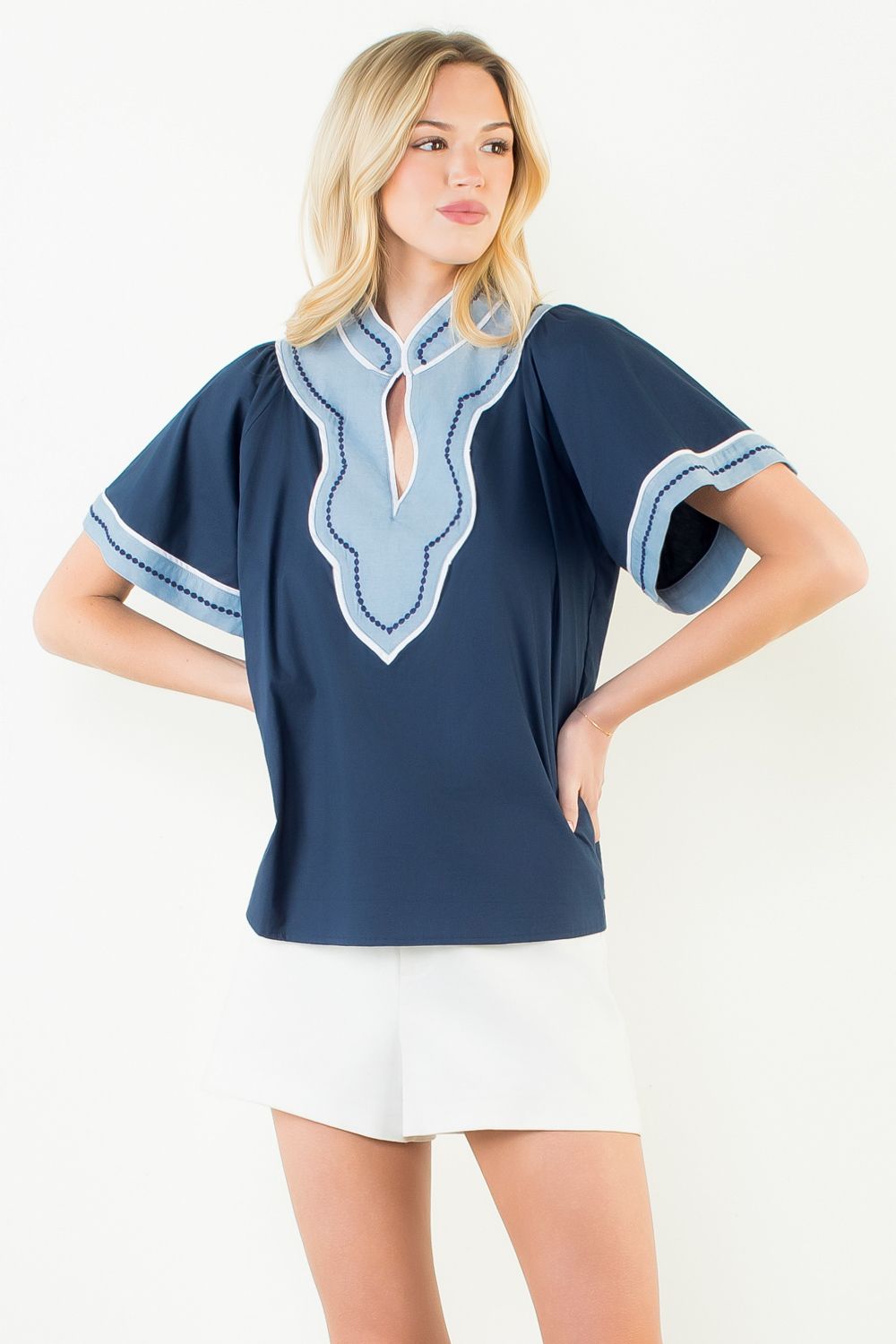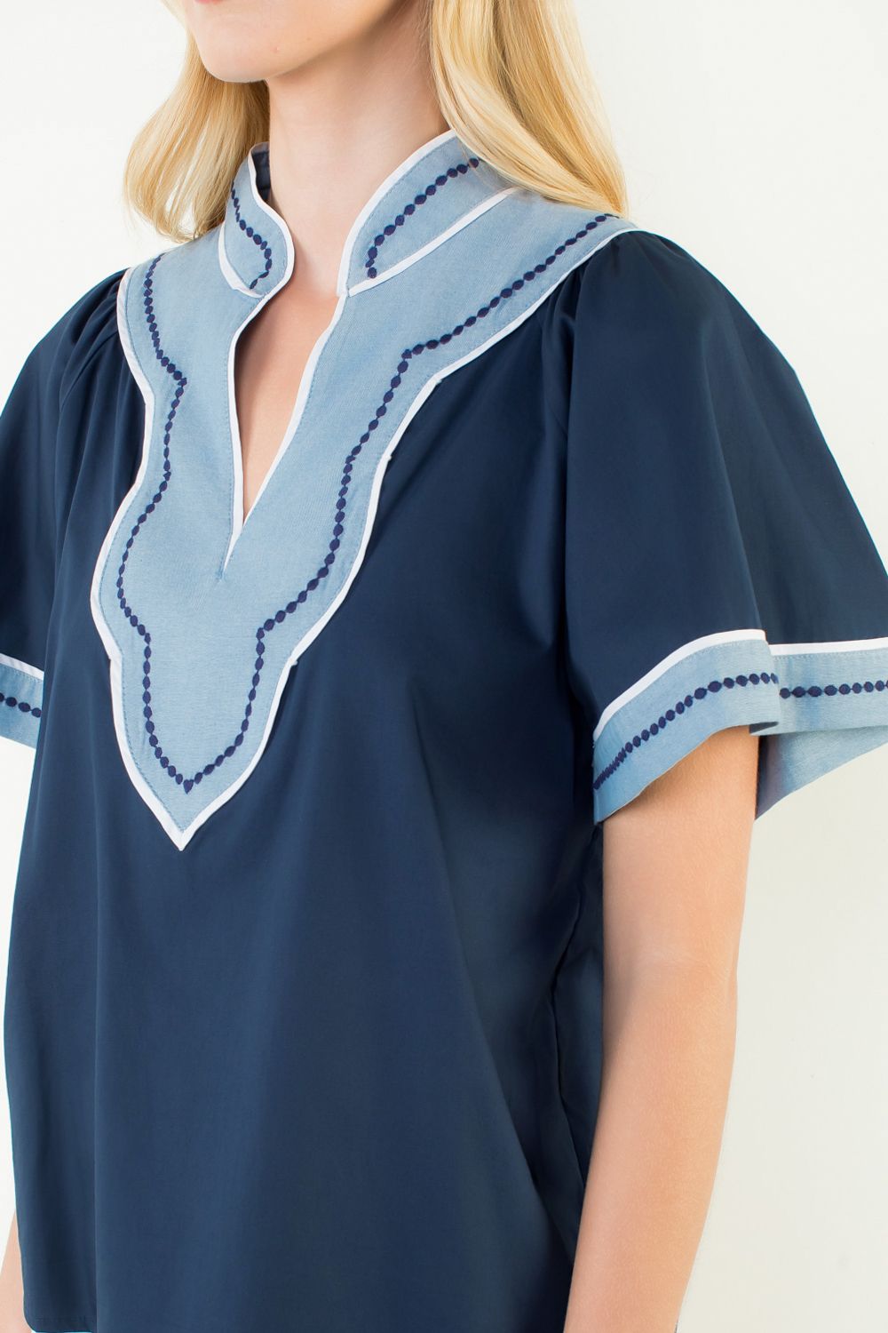 - Scalloped chambray contrast trim with embroidery detail