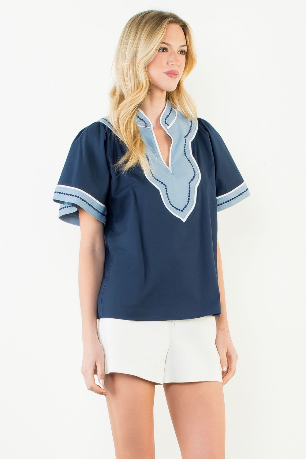 Meet the top that makes everyday outfits feel a little more special. Our THML Blue Scalloped Top is one of those easy, throw-on-and-feel-cute pieces you’ll reach for on repeat. Designed in a beautiful wear-anywhere blue, this top feature a flattering stand up collar, short sleeves, and the sweetest scalloped chambray contrast trim with delicate embroidery for that extra boutique-level detail.