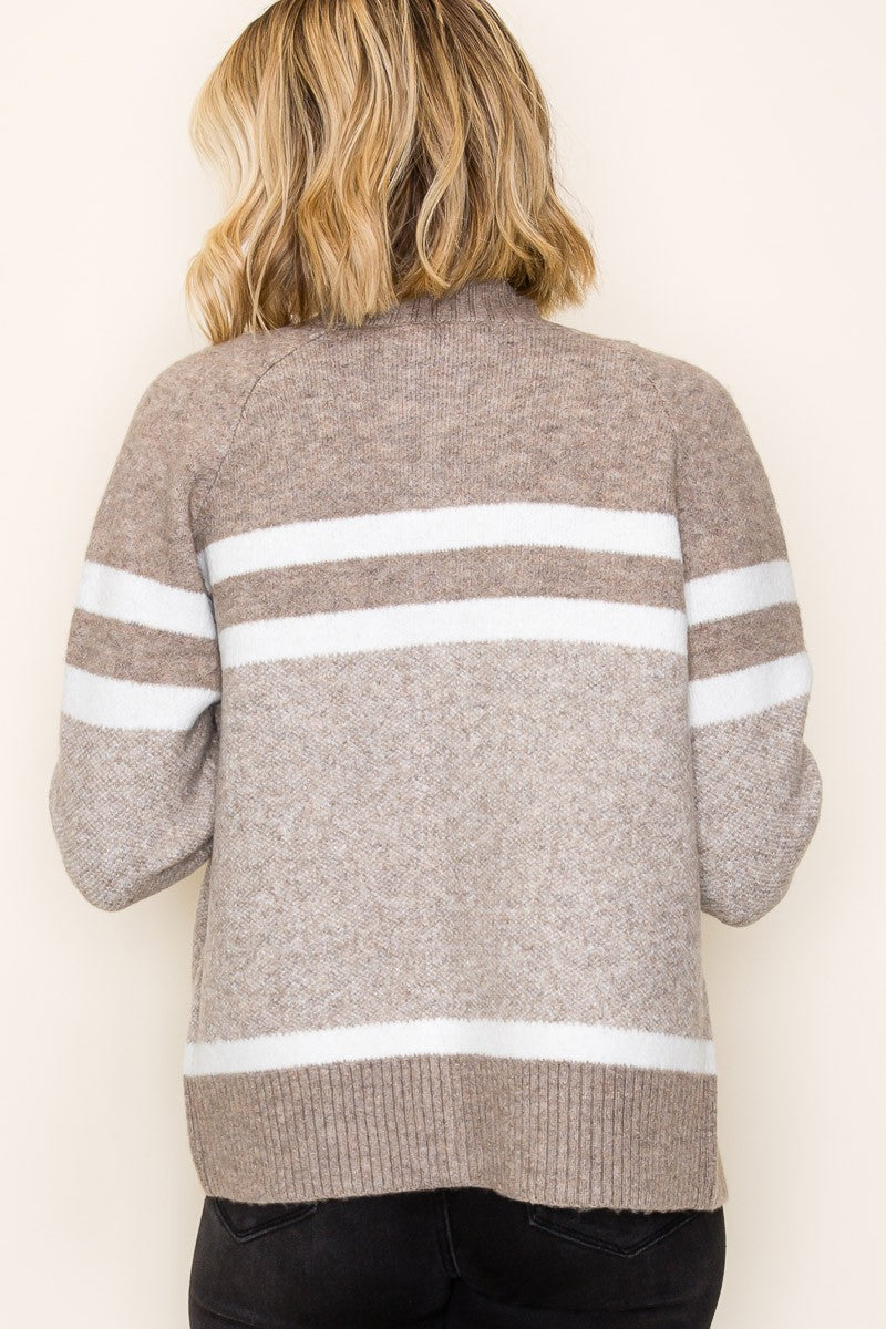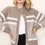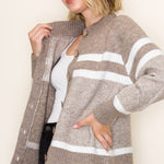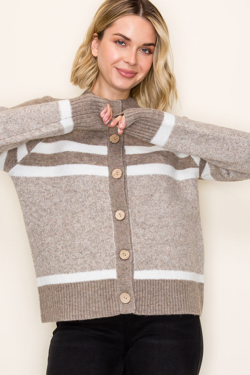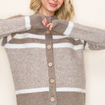 Stay stylish and warm with our Stripe Cardigan Sweater. This taupe sweater features a button front, long striped sleeves, and a stand-up collar. With its classic design and comfortable fit, it's the perfect addition to your wardrobe. Get cozy with this versatile and warm piece.