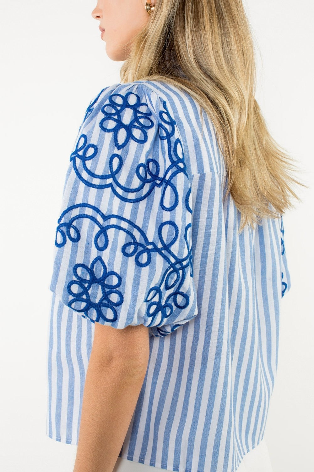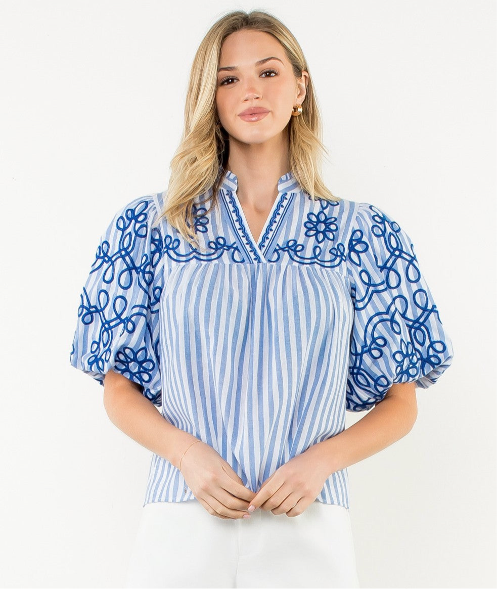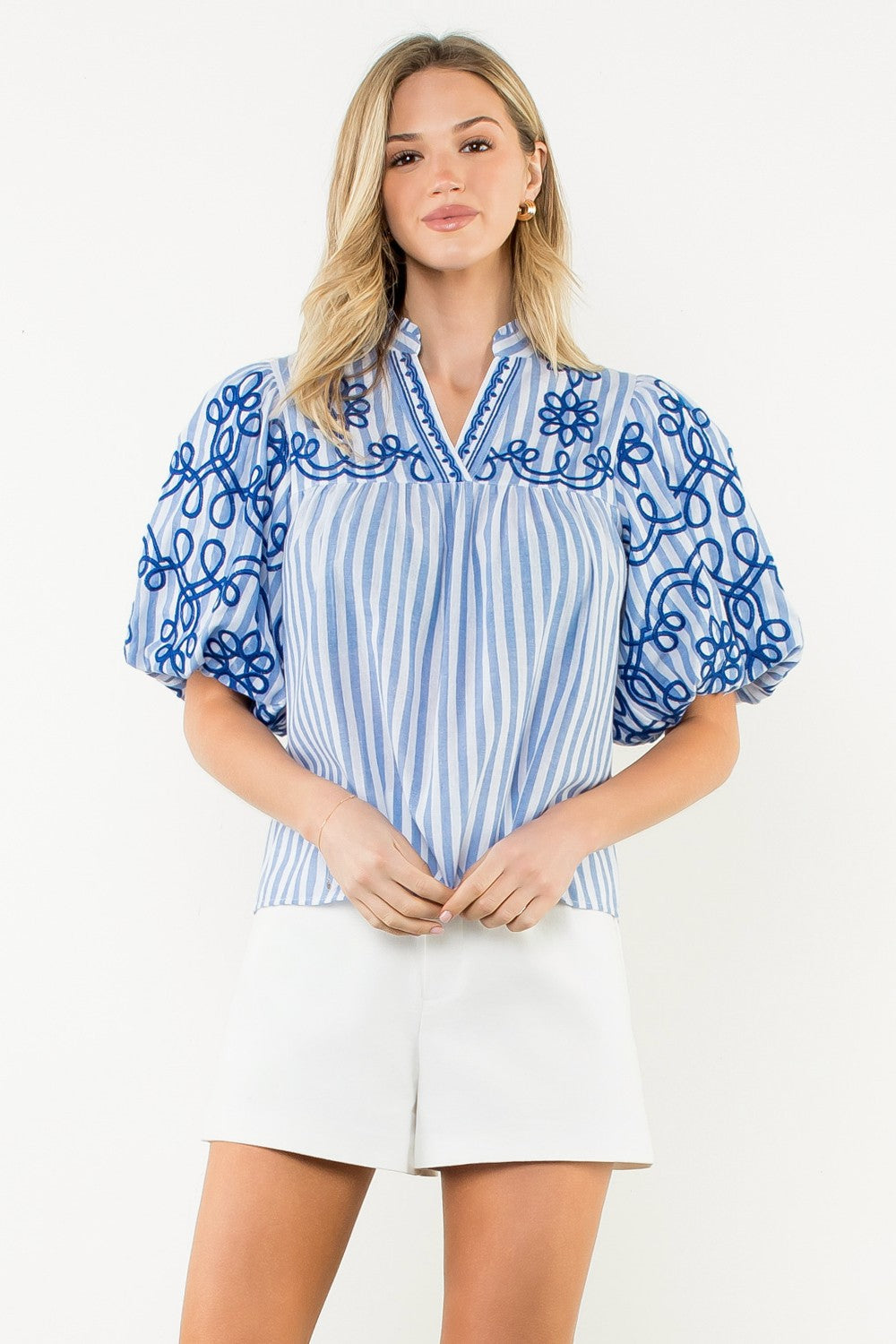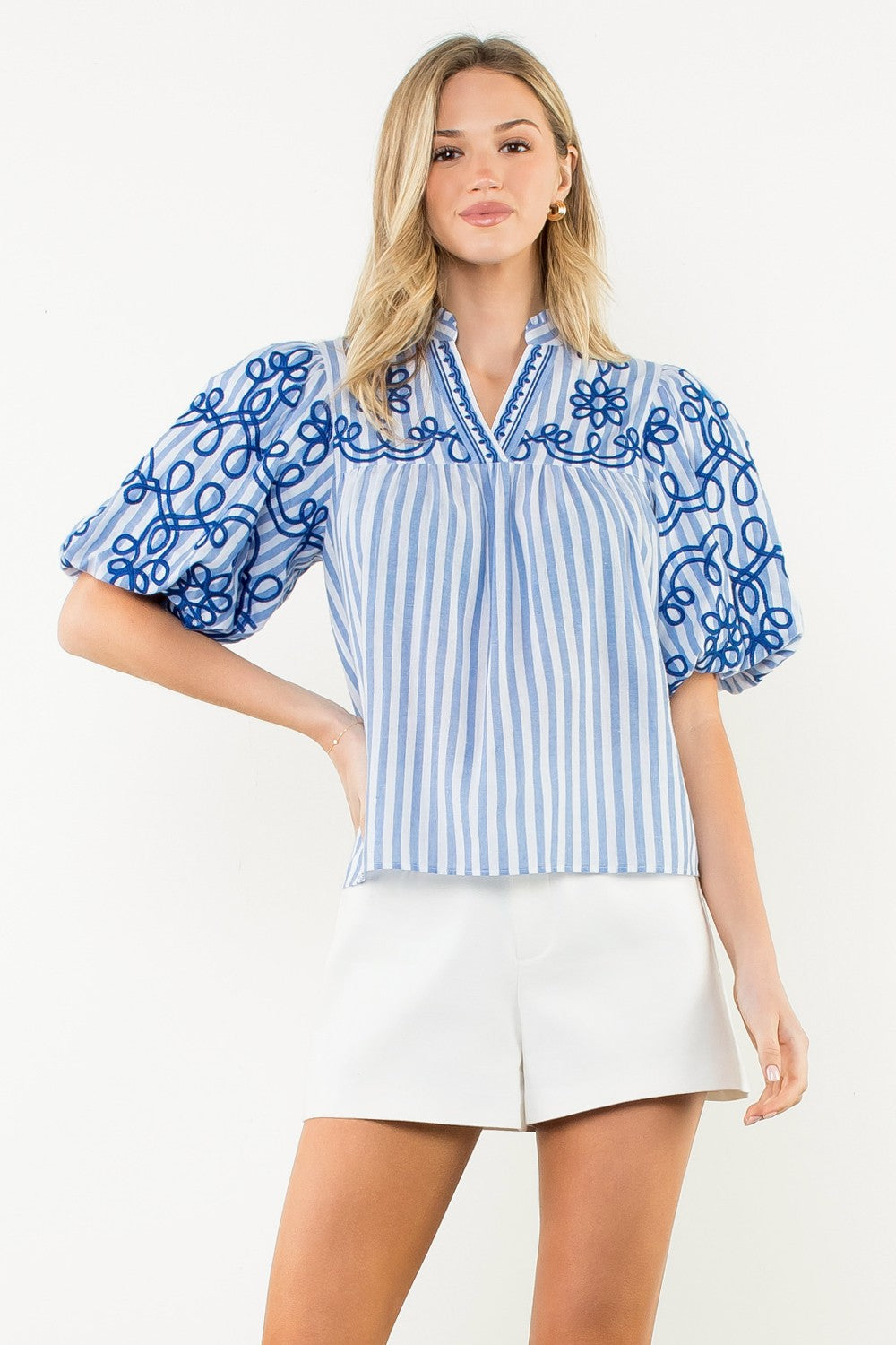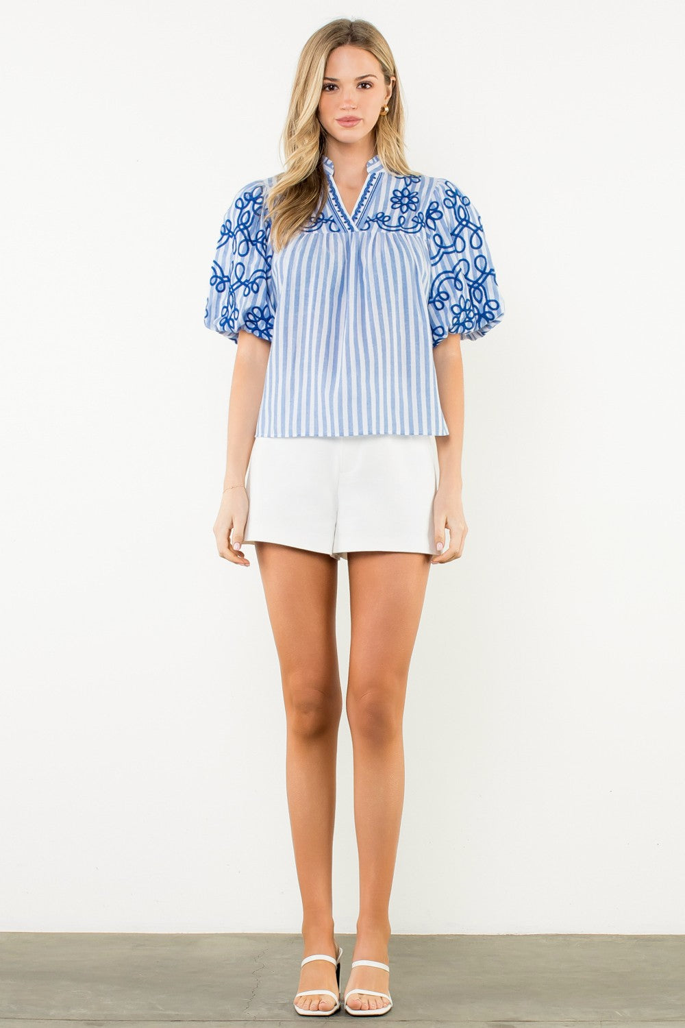 Elevate your everyday style with this chic THML blue and white striped top—a standout piece that’s equal parts classic and modern. Designed with feminine puff sleeves and accented by intricate blue ribbon embroidery, this blouse adds a pop of detail that sets it apart.