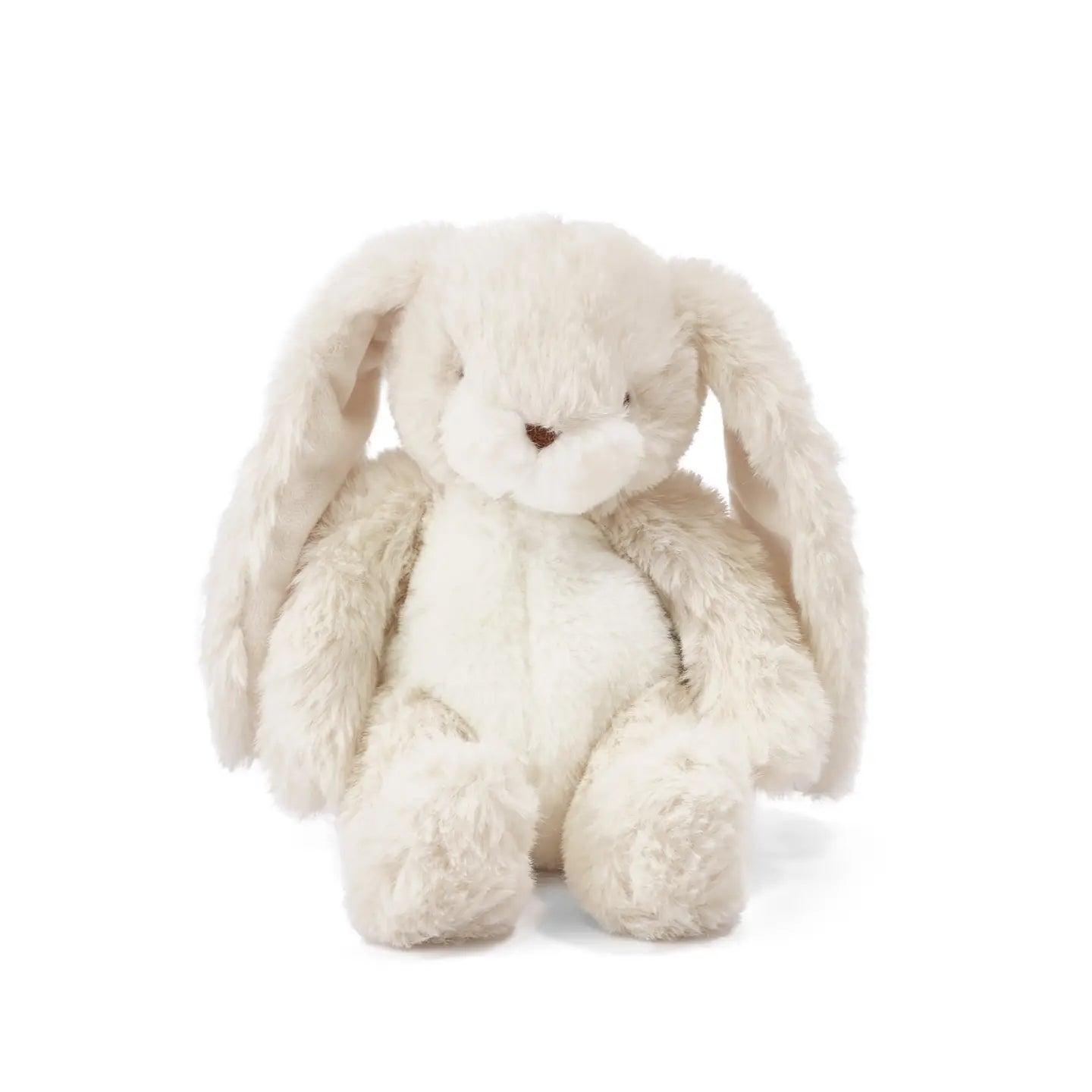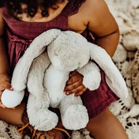Wee Nibble Stuffed bunny boasts buttery soft cream fur, with a hug-you-back body, hand-embroidered features, and too cute rosy cheeks. Long floppy, velour-lined ears perfect for soothing and loving!